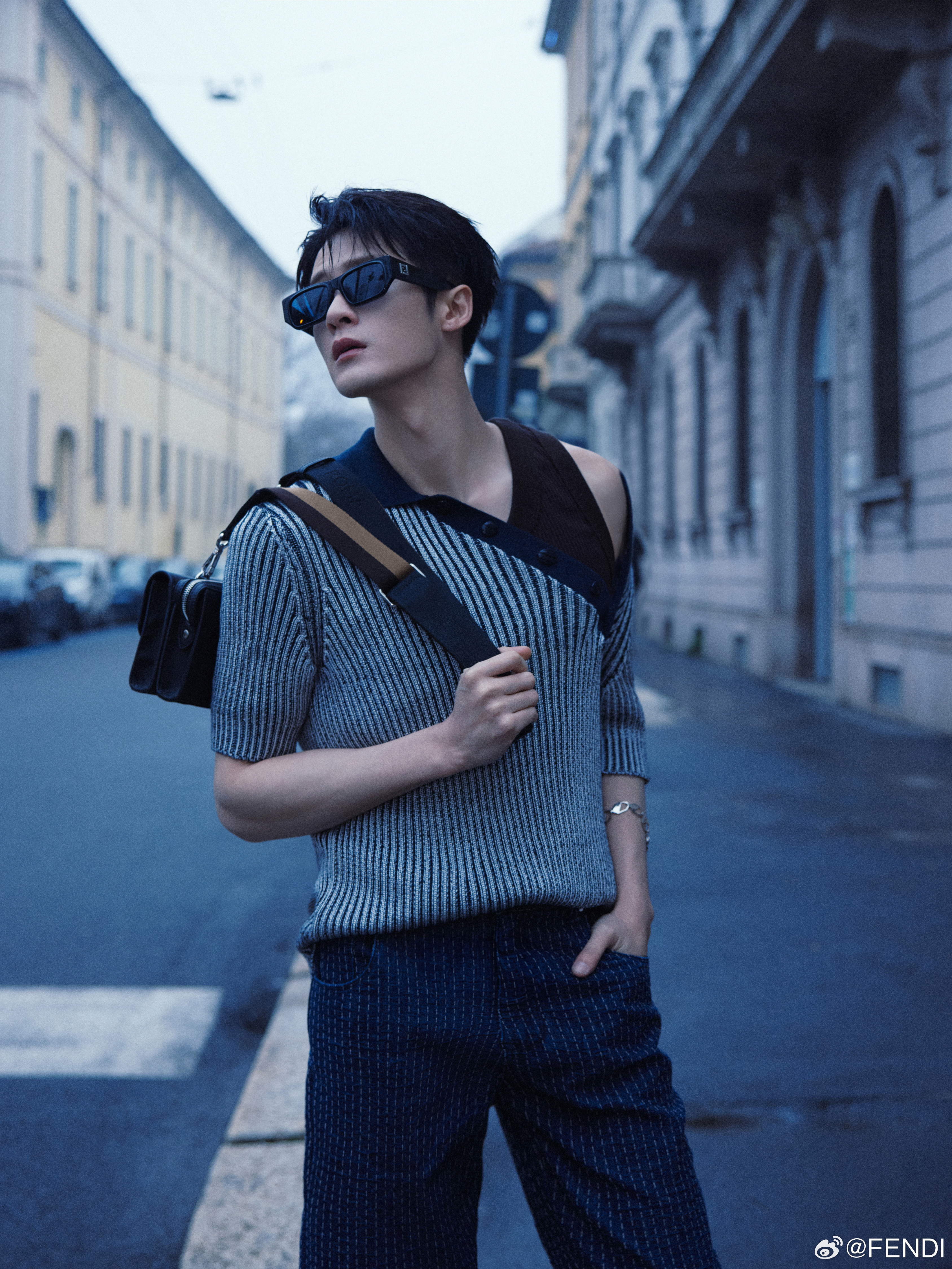 Fendi Menswear Spokesperson Tan Jianci wears the Spring/Summer 2025 Men’s Collection, paired with the Double Baguette handbag, effortlessly on the go, with details depicting a carefree moment.