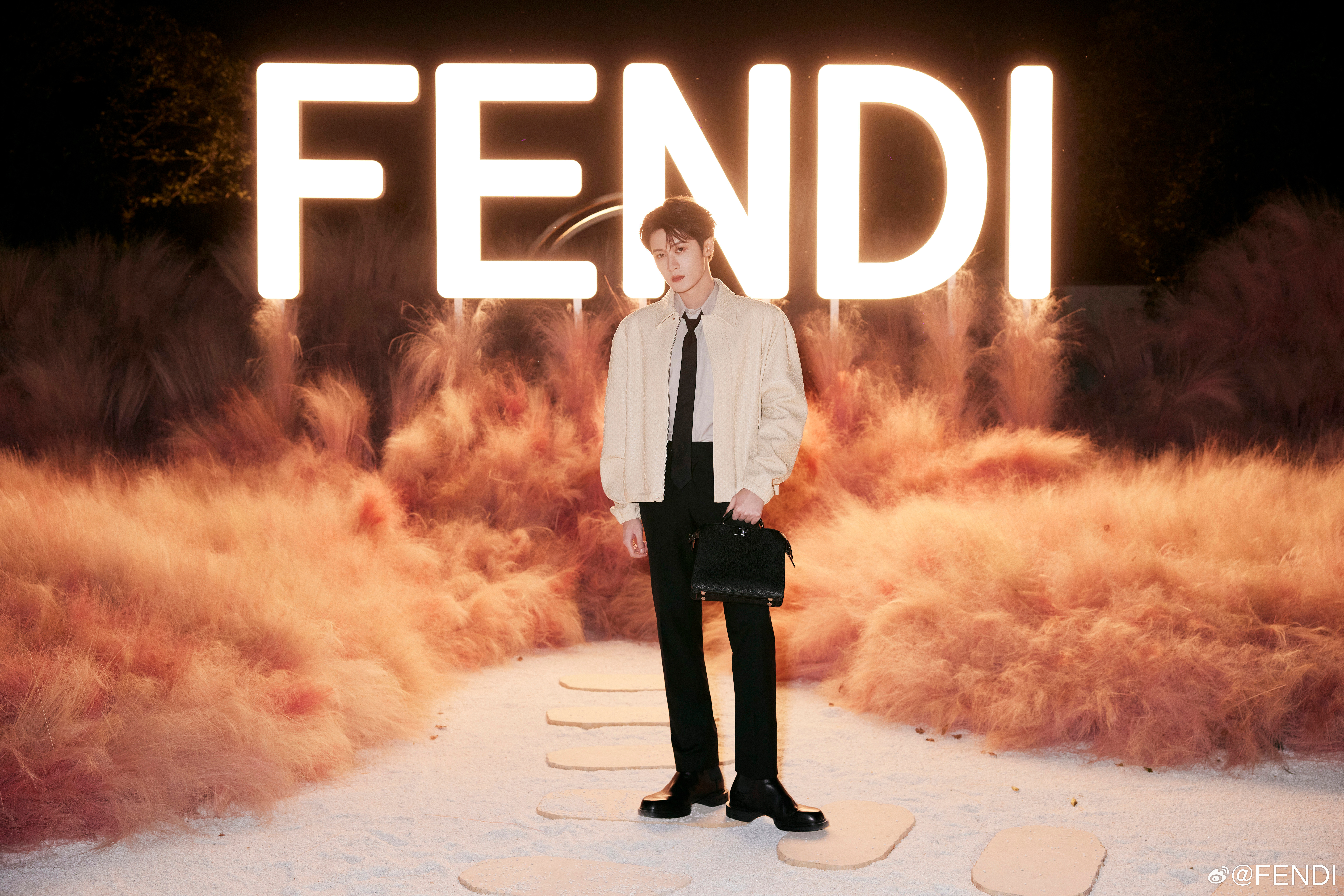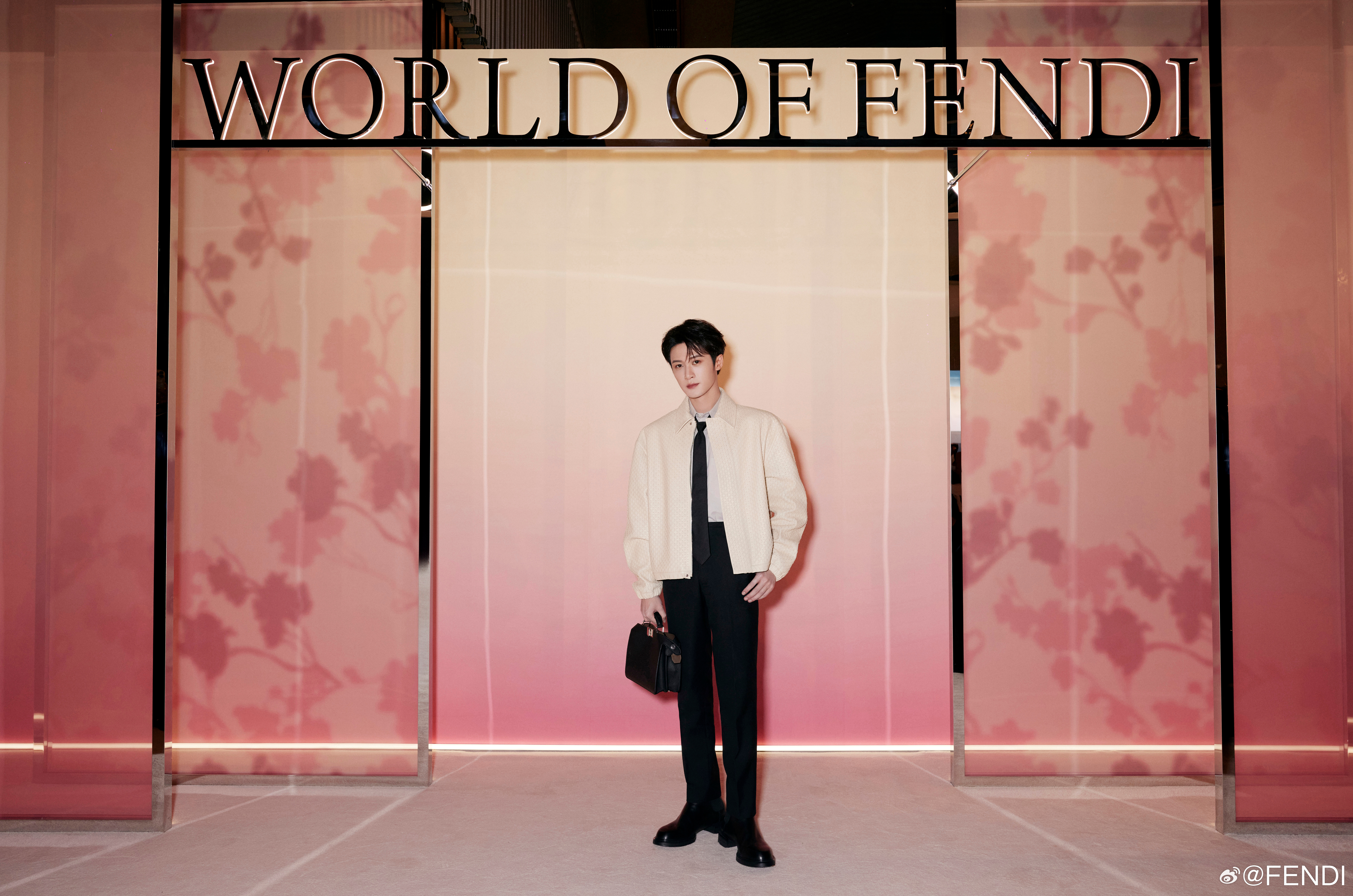 Fendi Menswear Spokesperson Tan Jianci wears the 2025 Spring/Summer Men’s Collection and a Peekaboo handbag to attend the World of FENDI 2025 Centennial Celebration, showcasing a clear new performance and exploring classic traces.