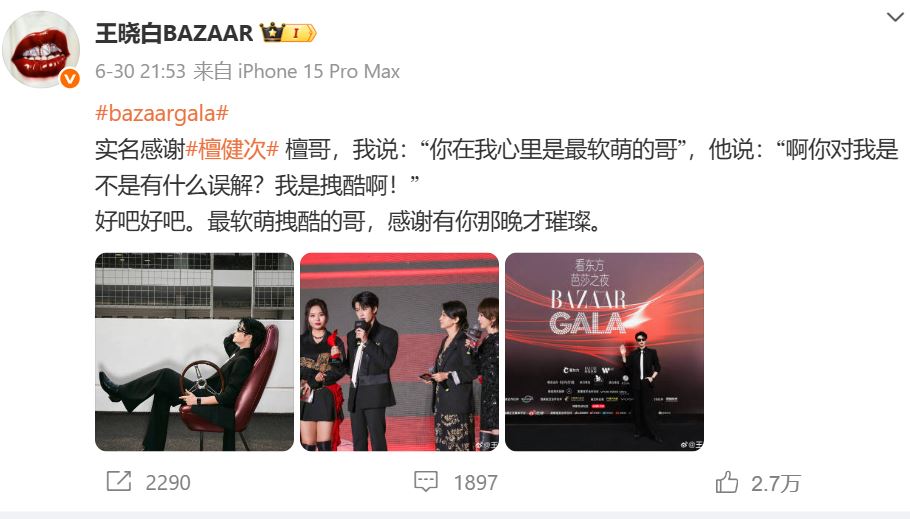 Sau thành công của Đêm Gala Bazaar, Tổng biên tập của Harper’s Bazaar, Vương Tiểu Bạch, đã cập nhật trên cả hai nền tảng :Weibo and Xiaohongshu (Tiểu Hồng Thư), lời cám ơn đích danh duy nhất đến Đàn Kiện Thứ.