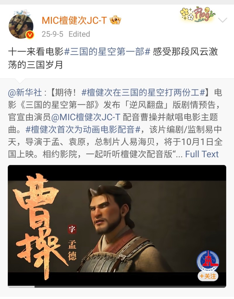 #Tan Jianci First Time Dubbing Animated Film#, the film is written/produced by Yi Zhongtian, directed by Yu Meng and Yuan Yuan, and produced by Yi Haibei. It will be released nationwide on October 1st. Join us at the cinema to hear Tan Jianci’s voice acting as Cao Cao recount the story of the Battle of Guandu~