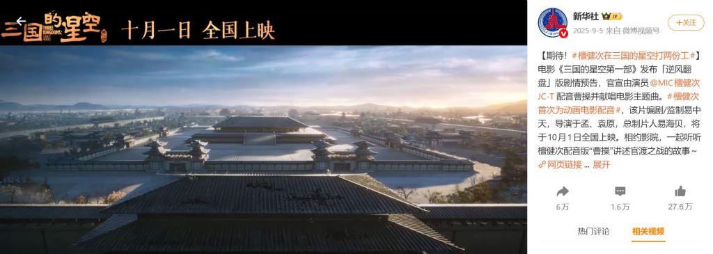[Looking forward to it! #TanJianci Works Two Jobs In Starry Sky Of The Three Kingdoms#] The movie “Starry Sky of the Three Kingdoms Part 1” released a “Turning the Tide” trailer, officially announcing that actor Tan Jianci will voice Cao Cao and sing the movie’s theme song.
