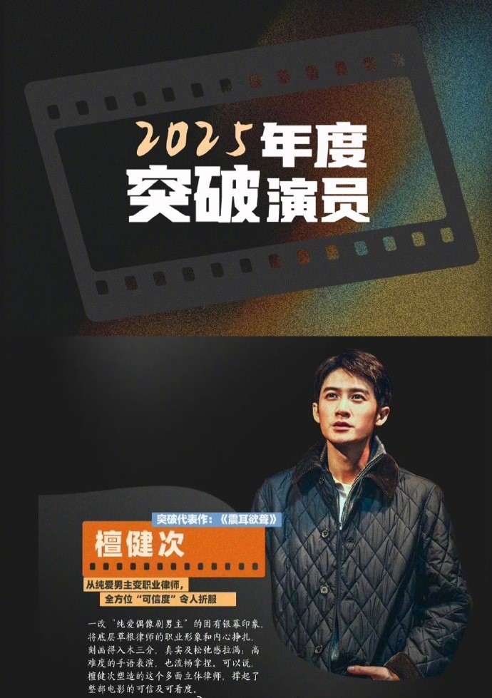 Đàn Kiện Thứ đã được Sohu Movies bình chọn là “Diễn viên đột phá của điện ảnh Trung Quốc năm 2025” nhờ màn trình diễn xuất sắc trong vai luật sư khiếm thính Lý Kỳ trong phim “Deafening”. Hình tượng nhân vật mang tính đột phá, khả năng diễn xuất bằng ngôn ngữ ký hiệu đầy thử thách và sự thể hiện chính xác chiều sâu tính cách nhân vật đã thu hút sự chú ý của giới điện ảnh và khán giả